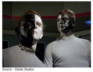 Let That Be Your Last Battlefield aired in 1969 where Lokai and Bele, two Cherons, despise each other for their differences. Both have skin that is black on one side, white on the other but the difference is “obvious” – Bele is black on the right side, white on the left while Lokai is white on the right, black on the left.