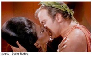A year after the US Supreme Court ruled interracial marriage was legal, Star Trek’s Captain Kirk locked lips with Lt Uhura in the Plato’s Stepchildren segment.
