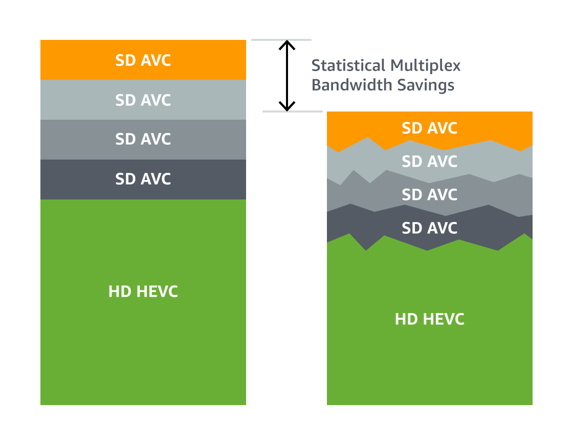 Statistical Multiplexing (Statmux) is now available with AWS Elemental MediaLive, Statmux is a technology used in live broadcast workflows that allocates bits in real time among multiple live video channels. It instantaneously adjusts the bitrate of each channel in the statmux pool to make the best use of total available bandwidth and combines the encoded outputs into a single transport stream. This maximizes network efficiency by optimizing picture quality for a group of channels within a fixed total bandwidth.
