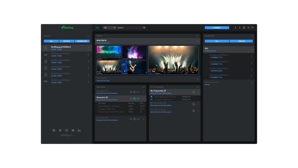 BirdDog Central 2.0 makes routing NDI video across the network easy; users simply select a source, a destination device or group, and hit ‘connect.’ And since Central Pro 2.0 is browser-based, users can quickly and easily access the NDI network from wherever they may be, providing a powerful, decentralized solution for managing complex broadcasts anywhere in the world.