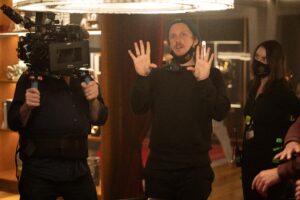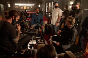 One challenge on the set was having a director who was also the leading actor. “Russell is an intelligent and seasoned filmmaker who’s worked with the best of the best,” said McLisky. “But for anyone, this would be a difficult challenge, with script amendments, location changes, and design changes…it’s a lot, not to mention COVID. Russell drew on his wealth of knowledge and experience to steer the course. He constantly challenged the cast to find a truth in the film, to make the performance personal. We spent a lot of time talking about his relationships with his friends and what his level of success meant to him. That served as an emotional entry point to understanding Russell’s connection to the characters. Working with Russell was inspiring, as he is very articulate and clear about what he wants. For example, Russell was adamant about us using three cameras. His experience with multicam films gave him a sense of comfort – to be capturing the scene as a stage play and to allow for flexibility of performance and safety in the edit.
