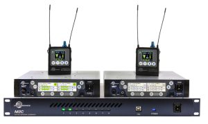 The Duet IEM system components include the M2Ra body pack receiver, the M2T/E01 dual-stereo half-rack transmitter, and the M2C-L wideband power combiner.