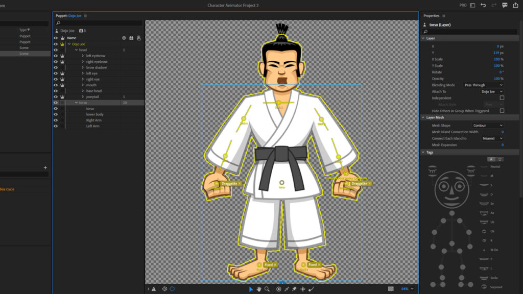 These puppets are imported into Character Animator, where they are rigged with a virtual bone or joint system. This allows creators to generate articulated features allowing puppets to move smoothly. Adobe hosts a palette of controls to define joint rules, anchor points, gravity, puppet flexibility, and interaction with other objects.