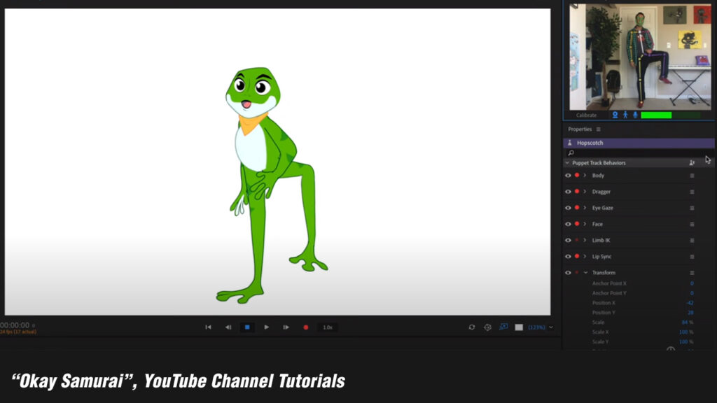 This feature is the real show-stopper. In addition to rigging your puppet ahead of time and determining specific motions, you can turn on the motion tracking mechanism which maps your own movement to the puppet in real-time. The best part is that it doesn’t require any fancy cameras, cables, or mocap suits. Using just the webcam on your computer, Character Animator can extrapolate the data and apply it directly to the puppet.