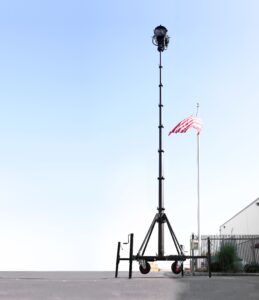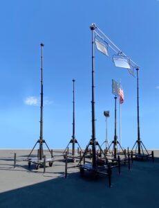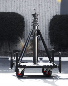The large leveling dolly platform base comes equipped with four telescoping legs for footprint adjustment (maximum 8’x8’/2.44×2.44m, collapsed 5’x5’/1.52×1.52m) and four heavy-duty jacks with 14″/35.5cm reach to level out the platform. The 8-section telescoping column can be easily removed from the dolly with a single wrench or can be left built and ready to transport in the back of the truck. The rotating Base at the bottom of the the column (or mast) offers a Lock and Pan Wheel around it to ease fixture positioning. Four rugged tires with breaks and security struts assure safe and smooth movement and secure lock down.