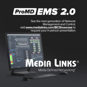 Media Links, manufacturer and pioneer in Media over IP transport technology, announces the debut of ProMD EMS Version 2.0 of its Enhanced Management Software for the Company’s MD Series Ecosystem solution portfolio. This portfolio includes the MD8000 Media over IP Transport platform, MDX100G IP Switches and the MDP3000 IP Media Gateways.