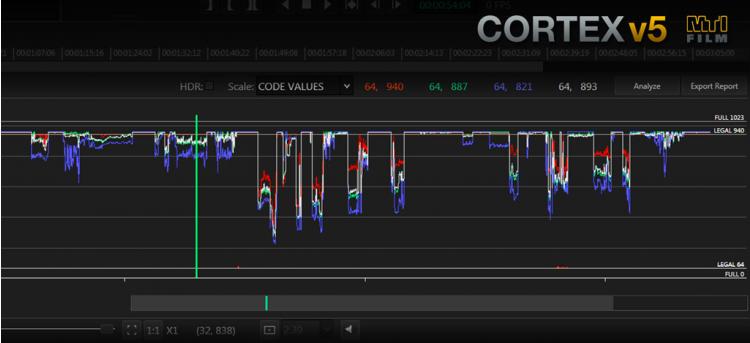 To support quality control workflows, CORTEX’s Quality Analysis node now allows for the creation of graphs and reports for analyzing media for a variety of metrics, including color levels, bit rate, MaxCLL/MaxFLL, and dead pixels.