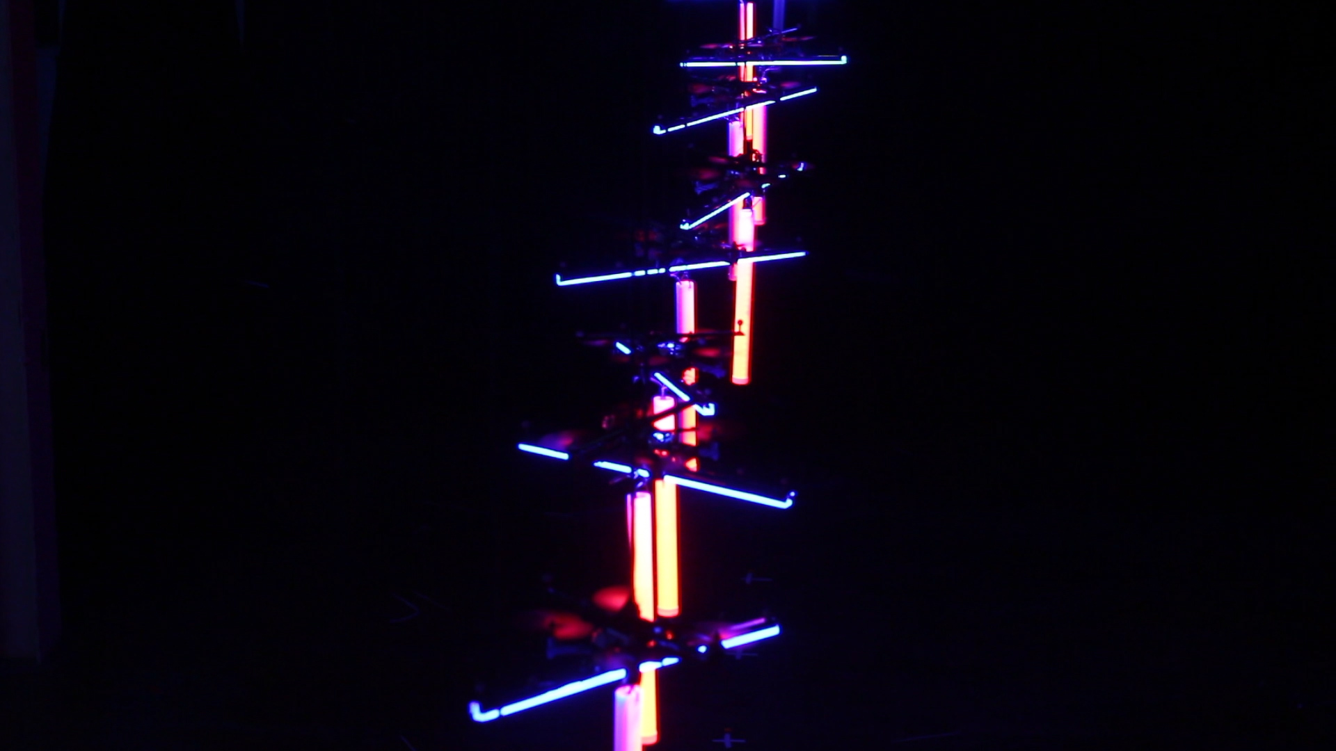 An artistic and technical feat, “Quantum Chromodynamics” involved the creation of 8,432 lines of code, 136 hours of programming, 290 hours of assembly, mathematical formulas developed by Aldo Vargas and synthesized recordings by electronic music specialist Ralp (Raül Peix) mixed with Ableton software. It also required an extensive equipment list including 12 commercial drones, 12 controllers, 12 OptiTrack Flex 3 and six OptiTrack Flex 13 cameras, one Sick LMS511 lidar scanner, one reactive audio system, 12 neon lights, 12 Arduino boards, 700 meters of cable and 576 electrical components. All of the gear was set up in an 11m x 15m area, surrounded by mounted OptiTrack cameras, and drones suspended from the ceiling in a snake like structure.