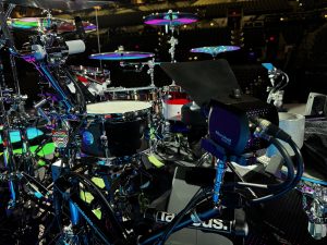 The last setup that Pineda created for Blink-182 included four CV380 cameras positioned around the drum set. One camera was placed behind it, aimed toward the crowd to capture the action. Another camera was positioned at the kick pedal, looking up at the drummer. The remaining two cameras were positioned at 45-degree angles on both the left and right sides, aimed across the drumheads to capture the performance. “The camera setup captures pretty much everything,” adds Pineda. “They are just small enough where the camera is not blocking the audience view or causing distraction.”
