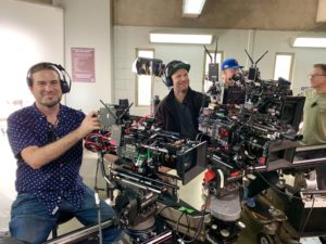 A three-camera set-up on stage, with (L-R) C-Camera Operator Judd Overton, A-Camera Operator Damian Church, On-Set Dresser Bruce Seymour, B-camera Dolly Grip Billy Pierson