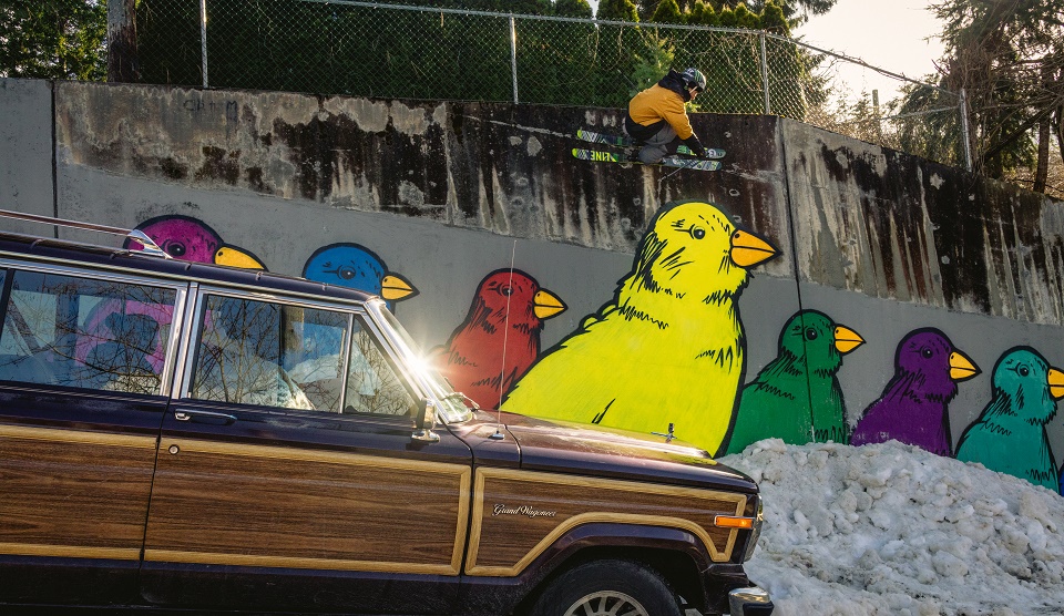While Mossop and Auclair largely improvised the scenes in All.I.Can¸ Imagination took months of careful storyboarding, choreography and stunt planning. “We wanted to ski on people’s roofs and do all sorts of crazy stuff, so it involved a lot of knocking on doors and asking permission,” says Mossop. “One particular scene involved a hairpin turn and it was going to be very hard to drive with the camera car and Tim skiing alongside. We had to close roads and get plows, gravel and sand—and we brought in Garvin Cross, who does the stunt driving for Daniel Craig in the James Bond films.”